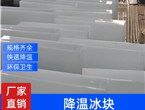 降温冰块又称工业冰块、大冰块、条冰、冰条、冰砖等。冰块每条有100斤、150斤、200斤规格。降温冰块是用纯自来水冷冻而成,温度在零下20度左右。降温冰块主要作为降温用途,生产过程中没有卫生要求,一般是在冰池里生产,将自来水倒入冰柜,加入一定量的盐氨和冷冻液后冷冻。